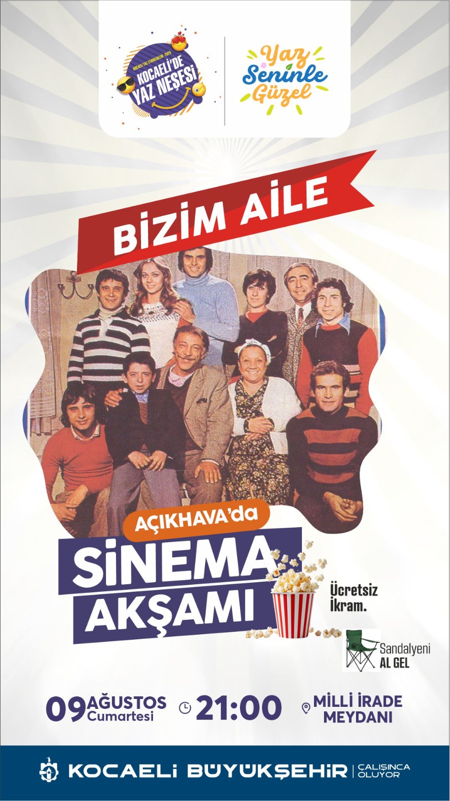 İzmit’in gözde noktalarından biri haline gelen Milli İrade Meydanı, “Yaz Neşesi” konseptiyle her cumartesi farklı bir sinema akşamına ev sahipliği yapıyor. Bu hafta 09 Ağustos Cumartesi günü (yarın) saat 21.00’de gösterilecek “Bizim Aile” filmi; birlik, dayanışma ve aile değerlerini konu alıyor. Münir Özkul, Adile Naşit ve Tarık Akan gibi Yeşilçam’ın usta isimlerinin rol aldığı film, izleyicilere geçmişin sıcaklığını ve Anadolu’nun samimiyetini hissettirecek.